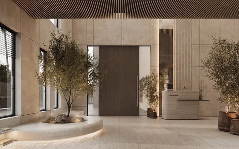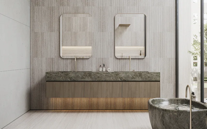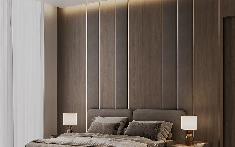 Fluted wood panels, matte lacquer panels, ribbed gypsum panels, metal-accented panels, illuminated glass panels, seamless stone panels