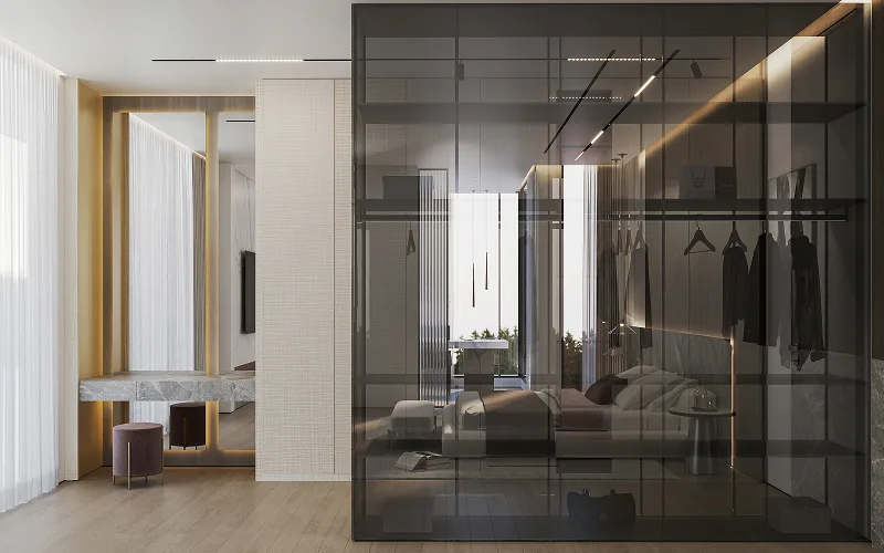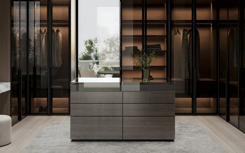 Open-frame closets, glass-enclosed wardrobes, island-style closets, concealed storage systems, integrated vanity units, modular shelving.